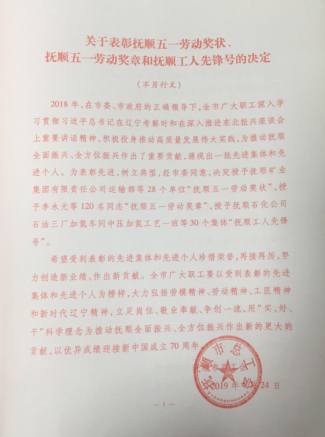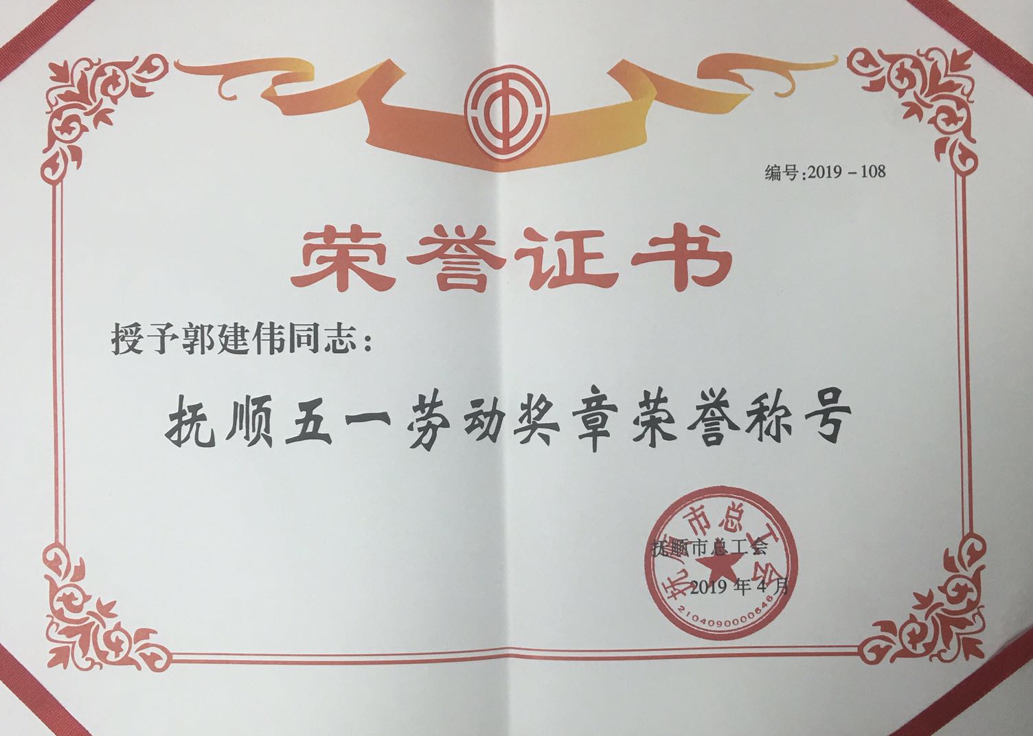 熱烈慶祝我單位任潤東、郭建偉兩位同志榮獲“撫順五一勞動獎章”榮譽稱號